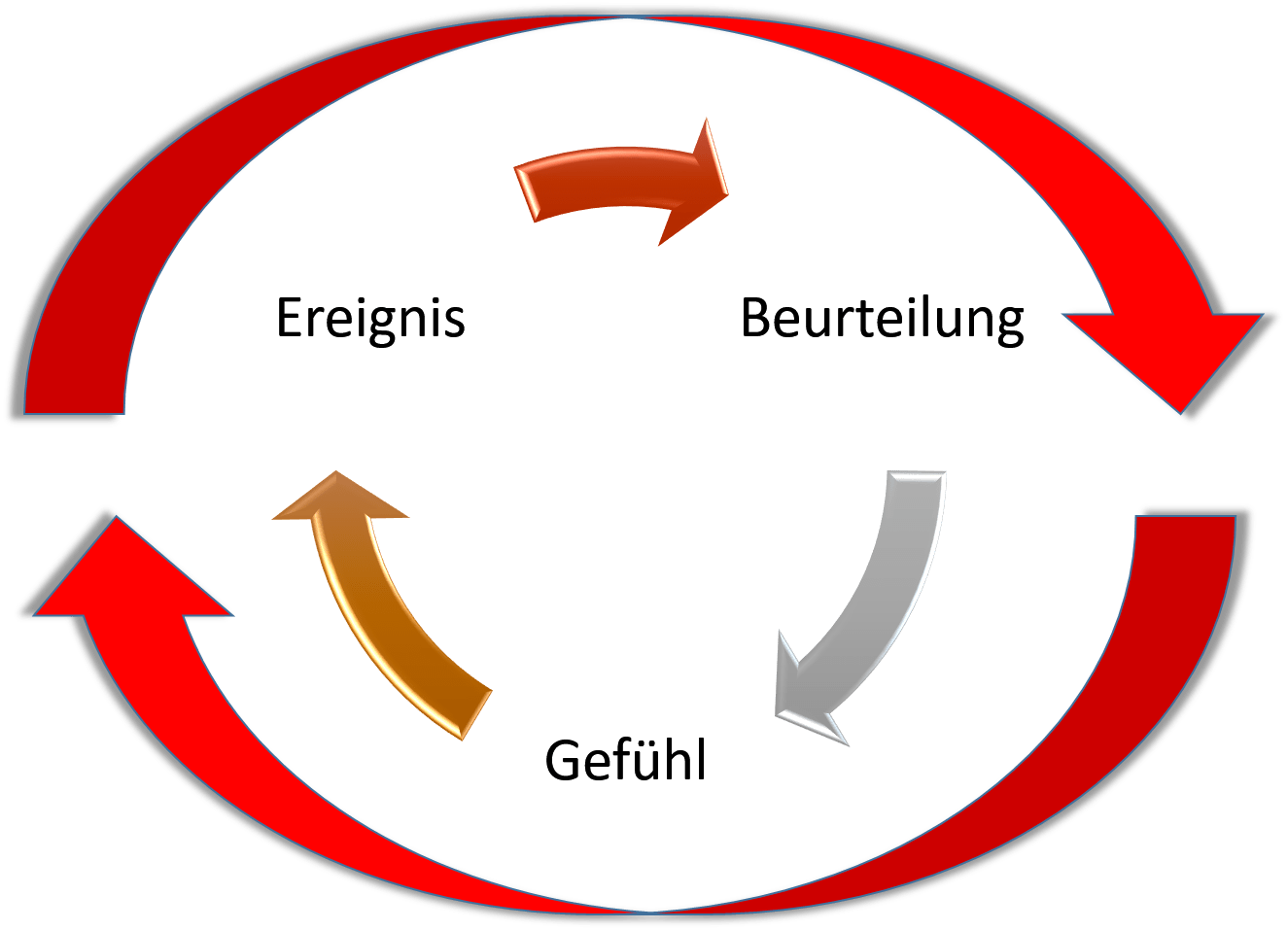 Wenn also zwischen Ereignis und Gefühl eine Beurteilung stattfindet, gibt es einen wirksamen Ansatzpunkt – die bewusste oder unbewusste Neubewertung/Neubeurteilung.